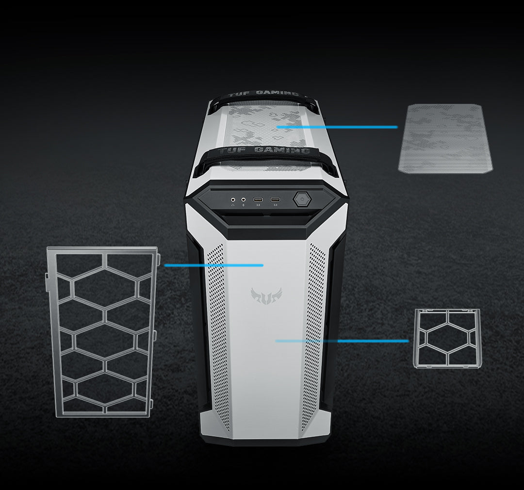 Diseñado para ser notado: Panel frontal de metal con patrón de salpicaduras TUF Gaming personalizado y panel lateral de vidrio templado ahumado de 4 mm de grosor para mostrar las partes internas de tu construcción.